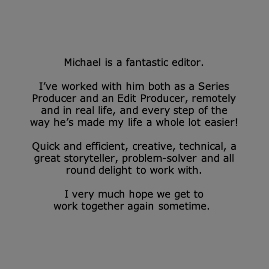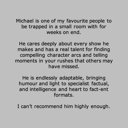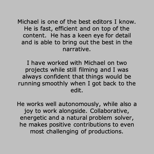 I am a London based editor passionate about crafting engaging stories and narratives. With over 20 years television experience and 10 years as a freelance offline editor, I have worked extensively with terrestrial broadcasters and streaming services.